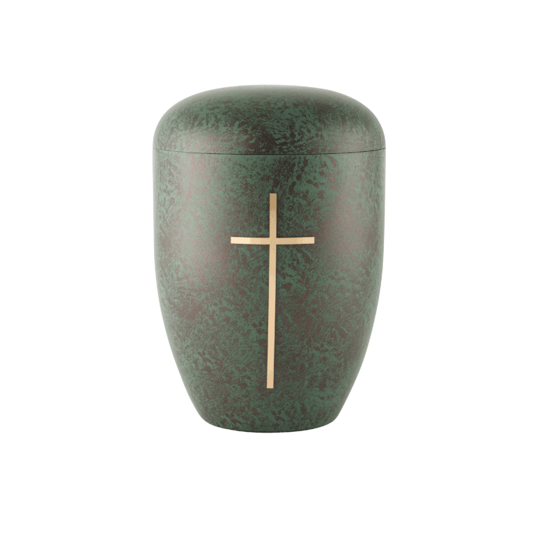Schmuckurne aus biologisch abbaubaren Komponenten, Grün (handpatiniert), Kreuz